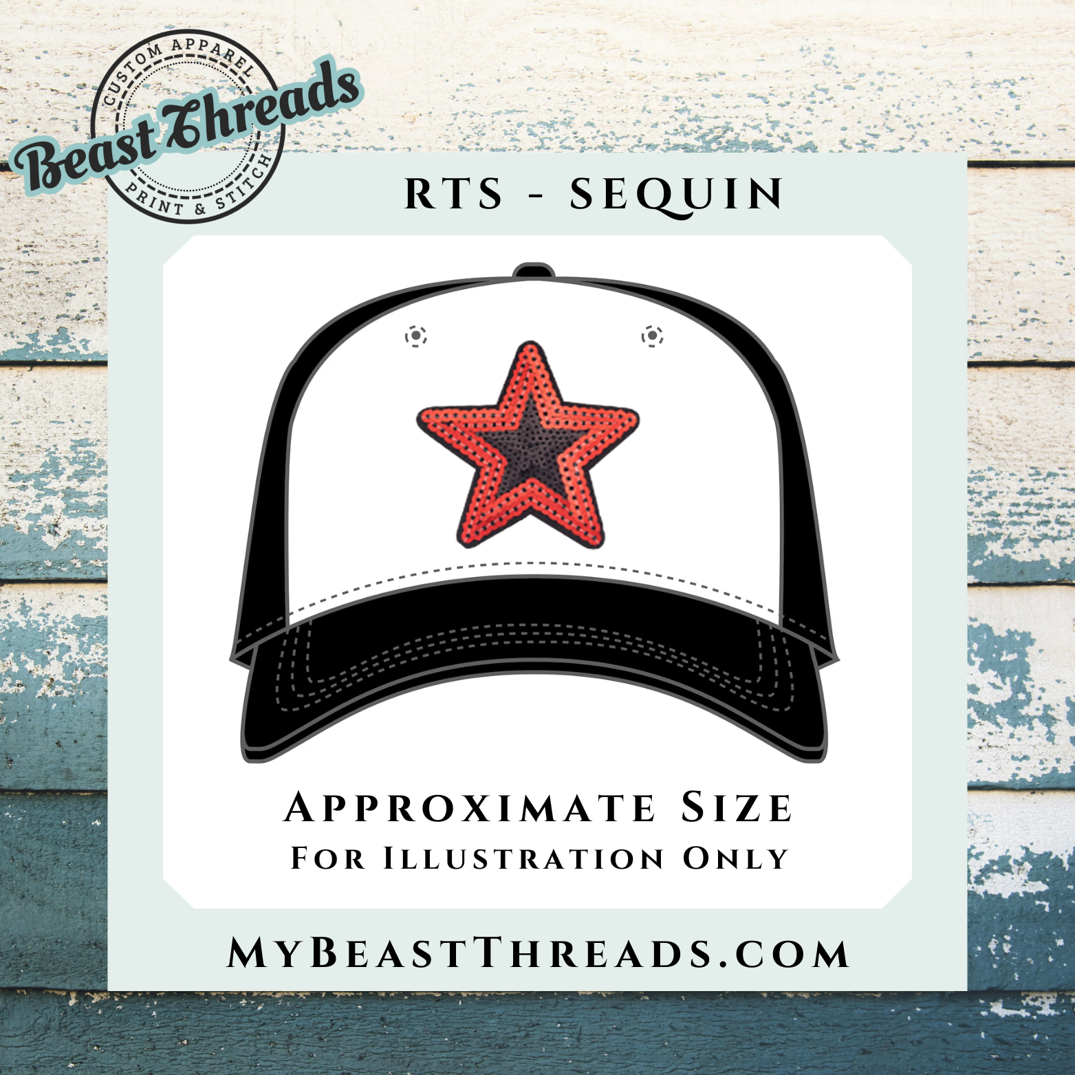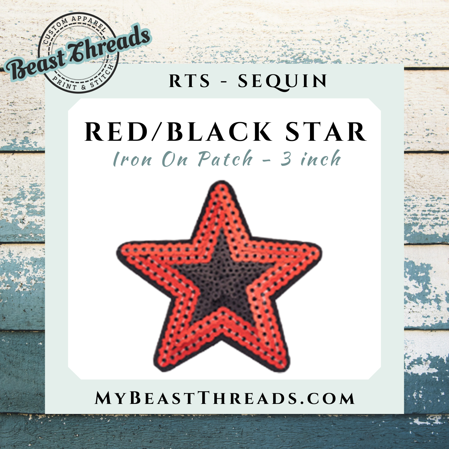 Add a touch of sparkle and fun to any outfit with this Black and Red Sequin Star Hat Patch. Perfect for jazzing up hats, jackets, or bags, its shimmering sequins catch the light and bring a playful vibe to your style. Ready to ship now!