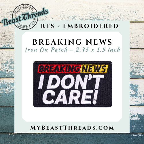Add a splash of cheeky fun with the Breaking News Embroidered Patch. Perfect for those who love to keep things lighthearted and a little bit sassy, this patch lets you say “I don’t care” in the most stylish way. Ready to ship now!
