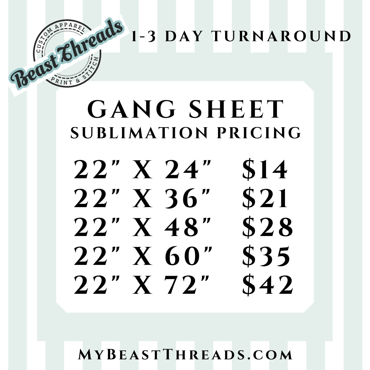 For quick turn-around time, please make sure your graphics are ready to print meaning your graphics are the size you want them on your gang sheet and that your gang sheet is saved as a PDF, JPEG or PNG.
