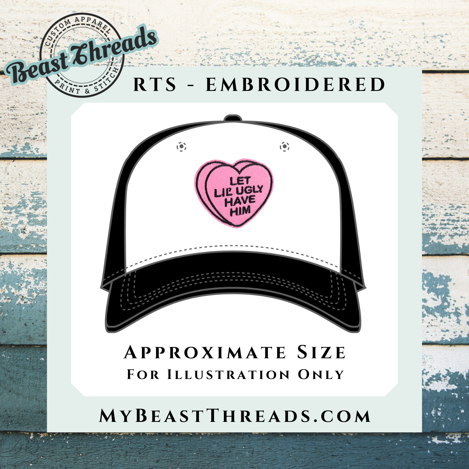 Add a cheeky twist to your style with the Conversation Heart "Let Lil' Ugly Have Him" embroidered patch! This playful patch features witty text in a fun, colorful design, perfect for sprucing up your hats, bags, or jackets.
