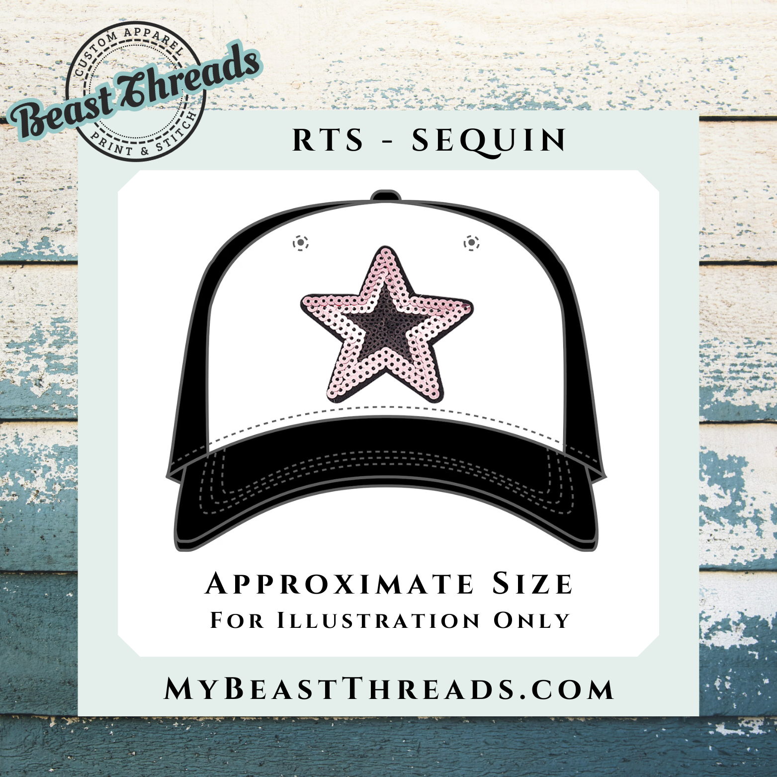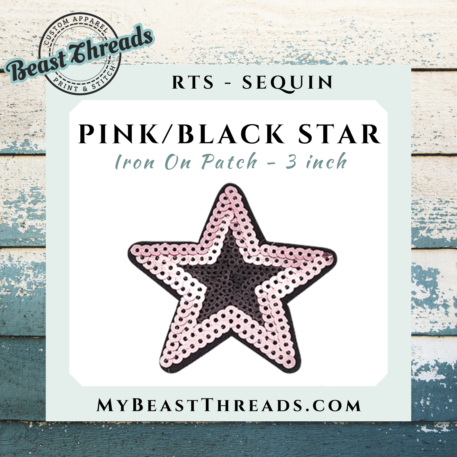 Add a touch of sparkle and fun to any outfit with this Pink and Black Sequin Star Hat Patch. Perfect for jazzing up hats, jackets, or bags, its shimmering sequins catch the light and bring a playful vibe to your style. Ready to ship now!