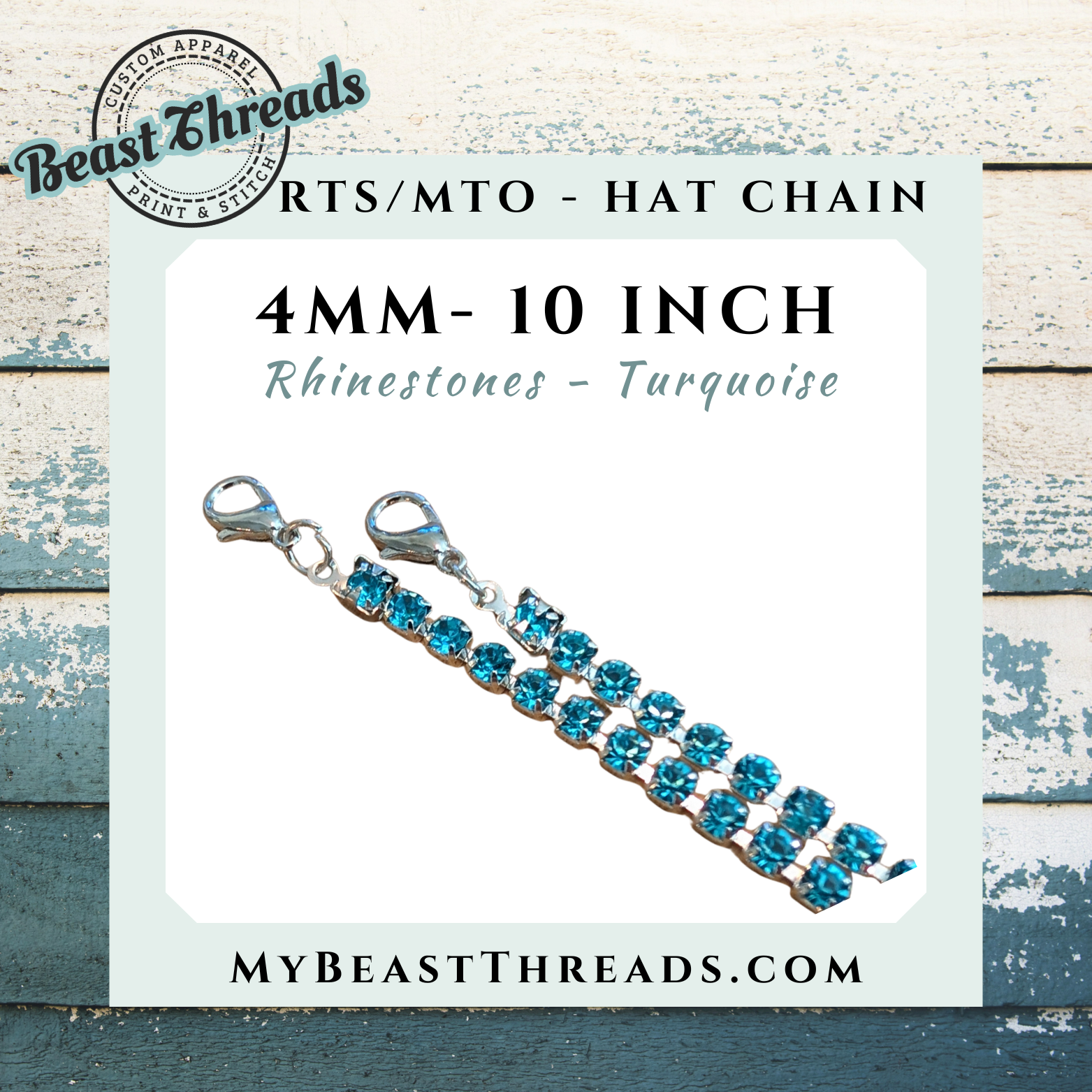 Add a sparkling touch with these 10-inch hat chains, available in dazzling rhinestones or elegant pearls. Designed like a classic tennis bracelet, they effortlessly elevate any hat, bringing playful charm and a bit of bling to your style. Ready to ship now! Larger orders, MTO with quick TAT.